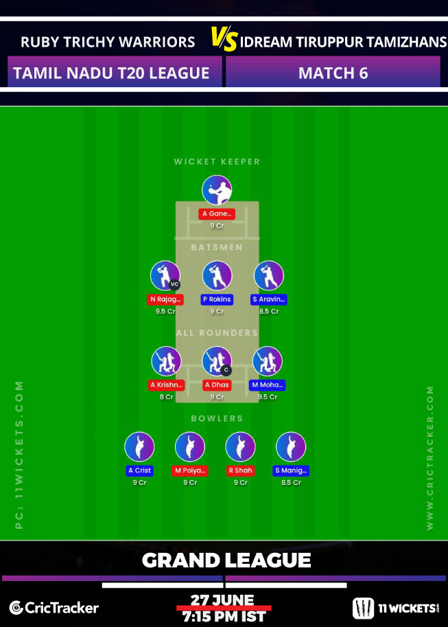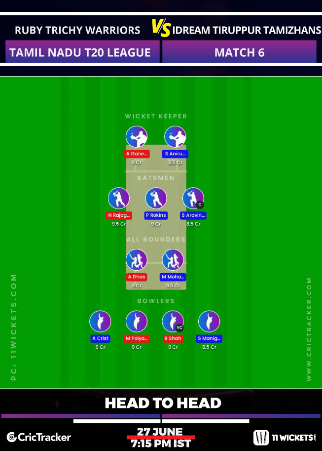 Ruby Trichy Warriors will face the challenge of Idream Tiruppur Tamizhans in Match 6 of the Tamil Nadu T20 League. Idream Tiruppur Tamizhans came last in the previous edition managing just 2 wins in the entire season and will be looking to have a better season this time around. On the other hand, Ruby Trichy Warriors won their opening match of this season against Dindigul Dragons and will start as favorites for this match.
